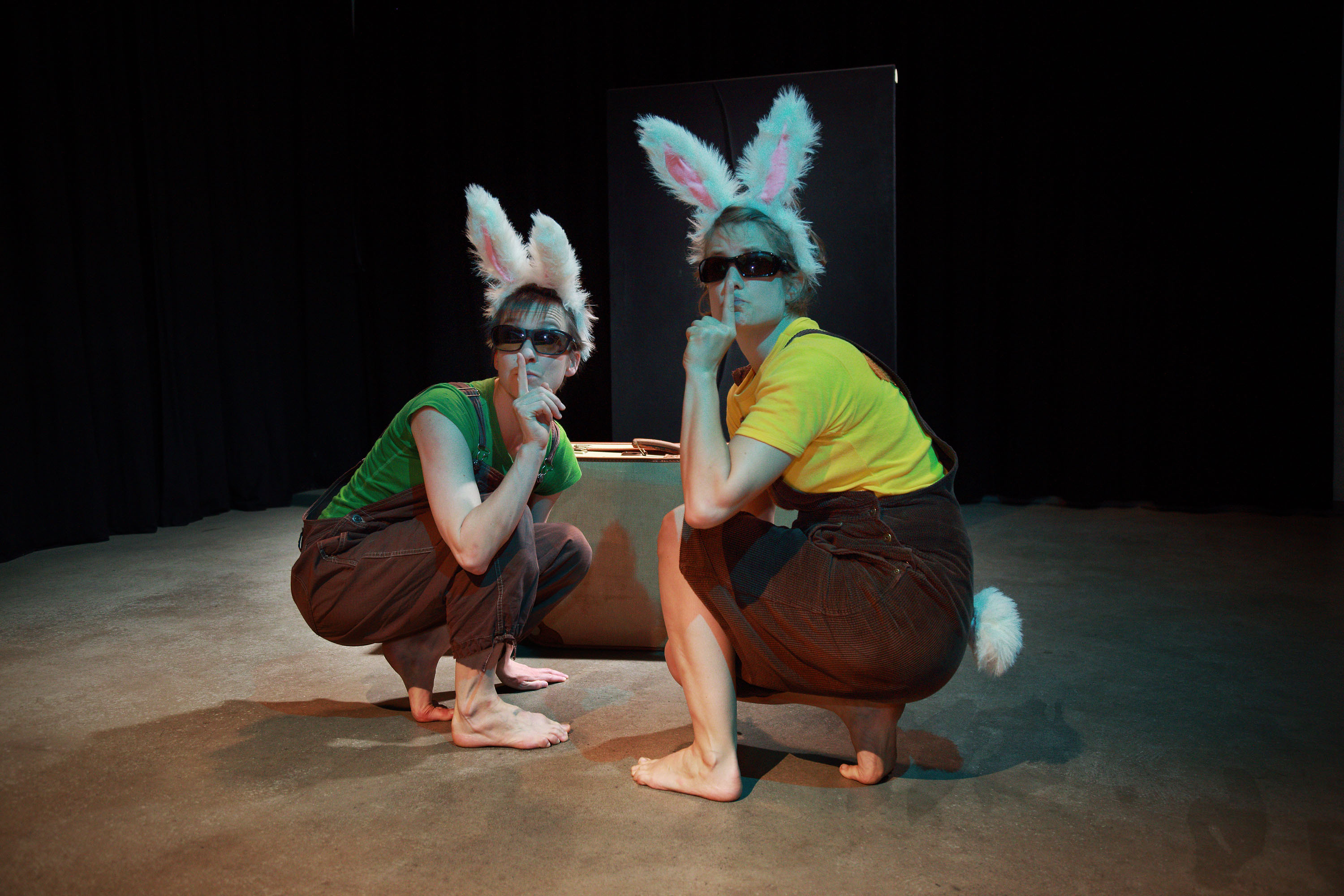 Auf humorvolle Weise erzählt die Compagnie Ach&Krach mit wenig Worten die Geschichte zweier Angsthasen, die auf dem Weg zu ihrem Monster vom eigenen Mut überrascht werden.